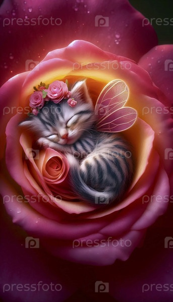 Крошечная фея-кошка спит в цвете, Ai generated image