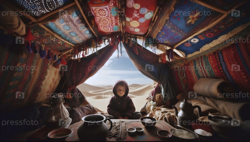 Ребенок, заглядывающий из красочного, драпированного интерьера кочевой палатки в пустыне с любопытным лицом, освещенным мягким светом, проходящим через ткань