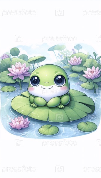 Кавайская сцена лягушки на подложке лилии, Ai generated image