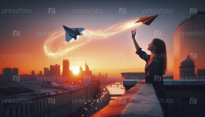 Женщина запускает бумажные самолеты, которые становятся реальными, Ai A generated image