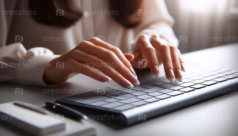 Руки, печатающие на клавиатуре в творческой атмосфере рабочего пространства, Ai generated image