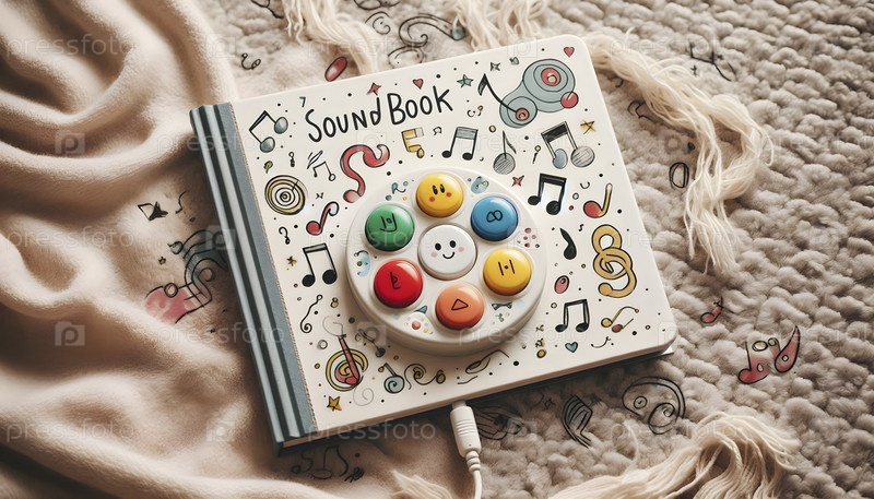Детская звуковая книга с кнопками для нажатия, размещенная на мягком ковре, Ai created image
