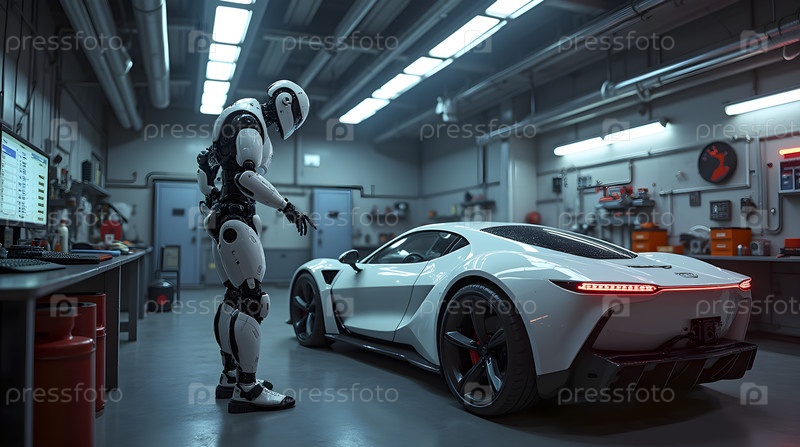 Футуристическая мастерская с роботизированным механиком, ремонтирующим электромобиль, Ai generated image