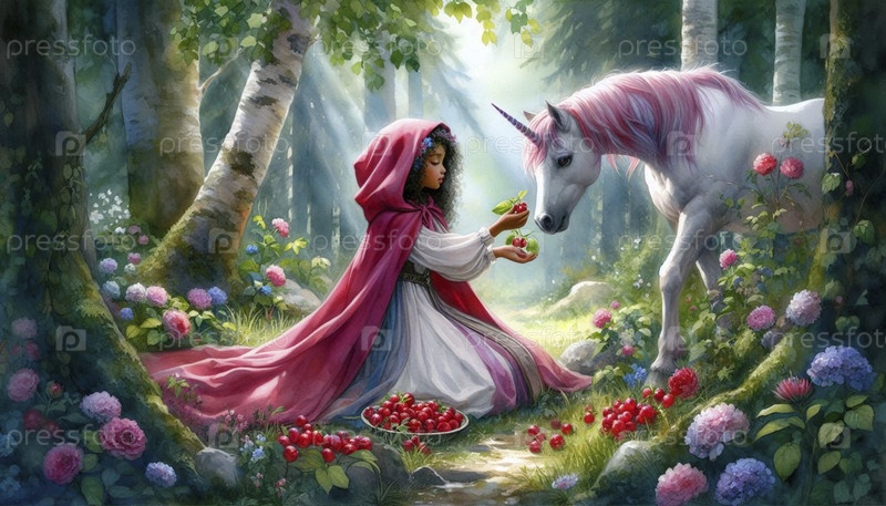 Принцесса и единорог Делятся акварельной живописью Берри, Ai generated image A