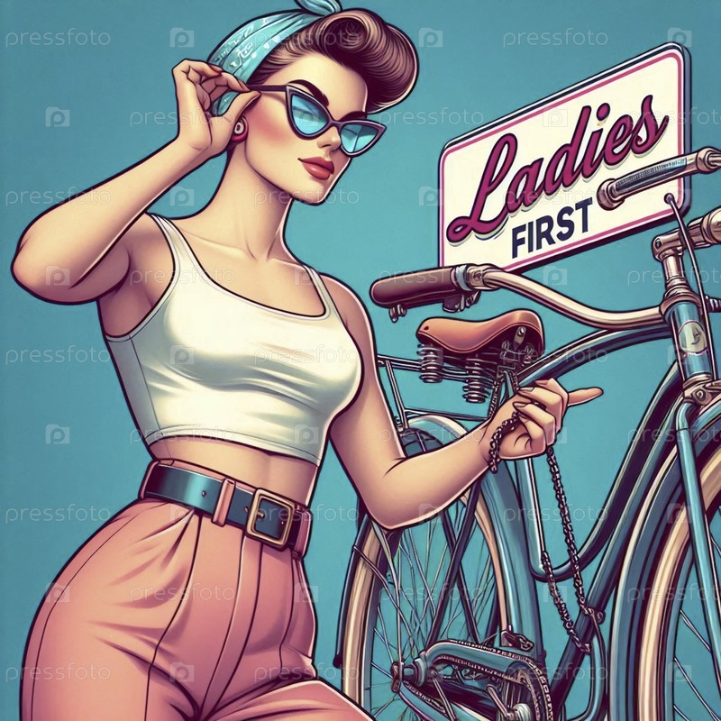 Пин-ап девушка, держащая знак Ladies First во время ремонта велосипеда, Ai generated image
