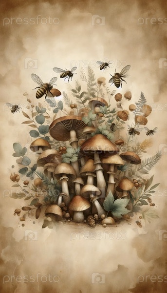 иллюстрация пчел и грибов