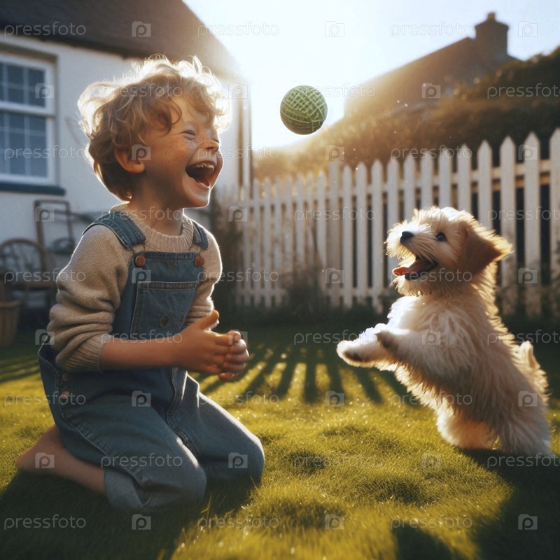 Маленький мальчик, играющий с щенком золотистого ретривера в прекрасно ухоженном заднем дворе пригорода, Ai generated image