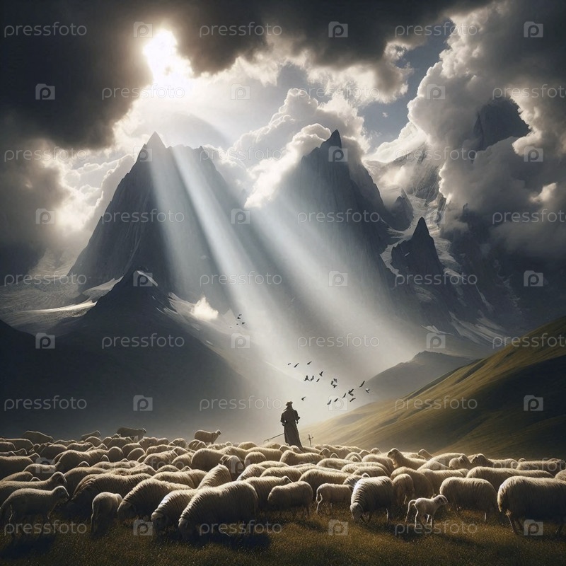 Пастух, передвигающийся со своим большим стадом через высокий горный перевал с размытыми штормовыми облаками и солнечными лучами, создающими божественный свет