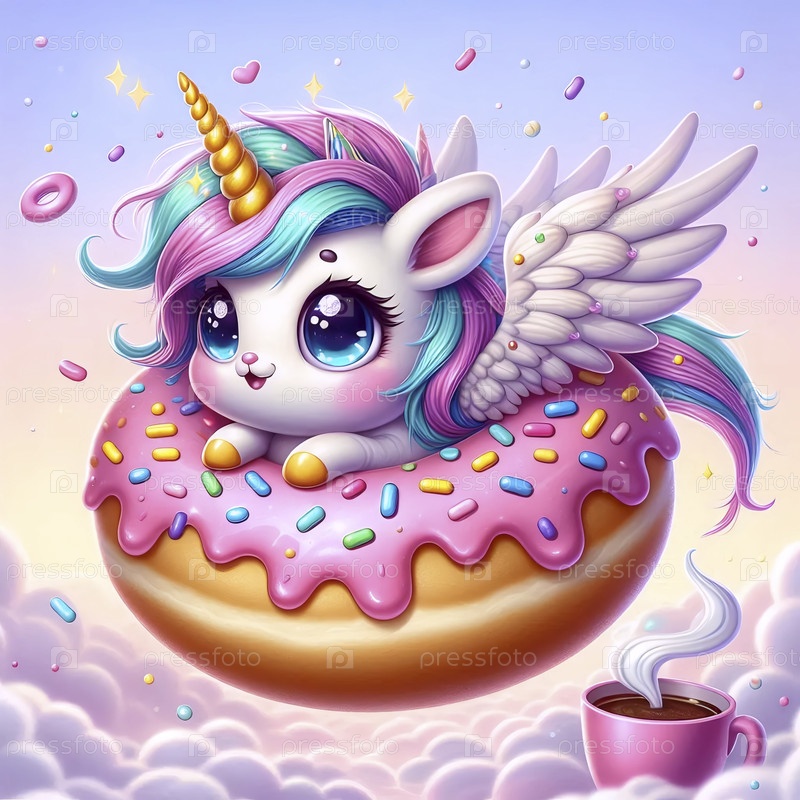 Подробная иллюстрация кавайи пончик-единорог, Ai generated image