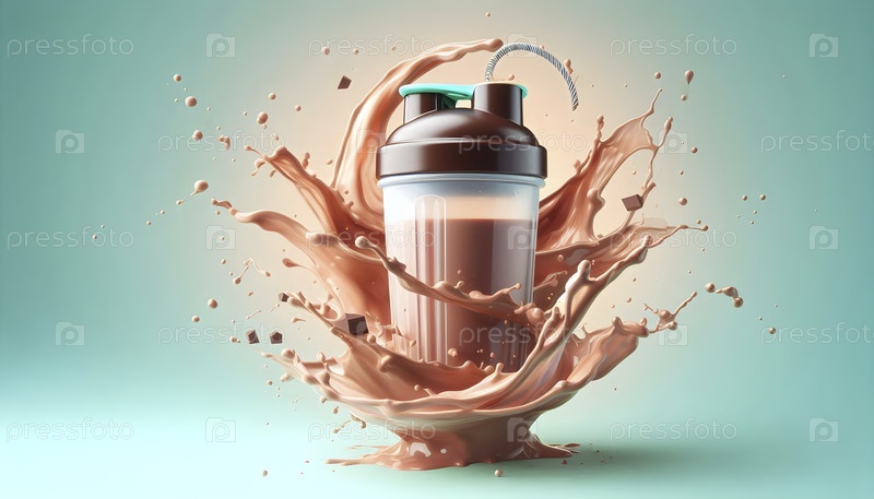 Изолированная прозрачная бутылка для шейкеров с вращающимся шоколадным белковым напитком, Ai created image