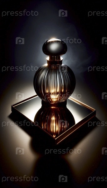 Мокет бутылки с парфюмом из темного копченого стекла на зеркальной подносе, Ai generated image