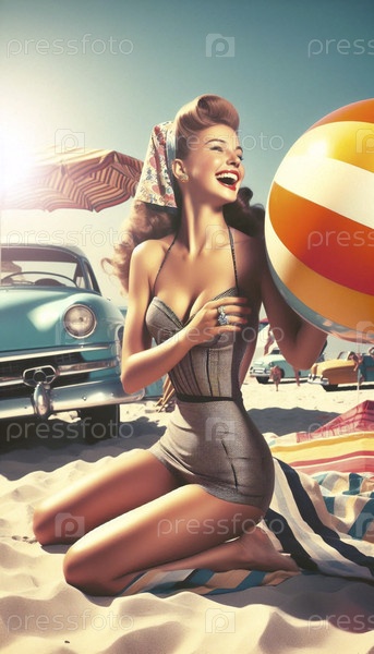Пляжная девушка 1950-х годов с винтажным пляжным мячом, Ai generated image