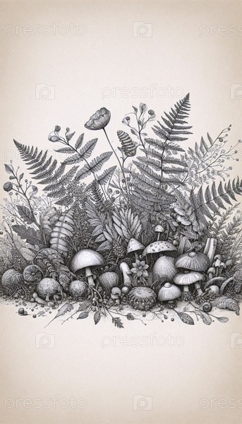 Ботаническая иллюстрация лесного ландшафта, Ai generated image