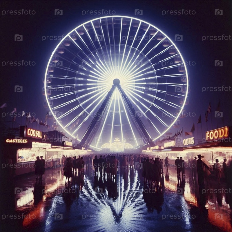 Живая вечерняя сцена на краевой ярмарке, с огнями обозрительного колеса, отражающимися в луже, Ai создала изображение