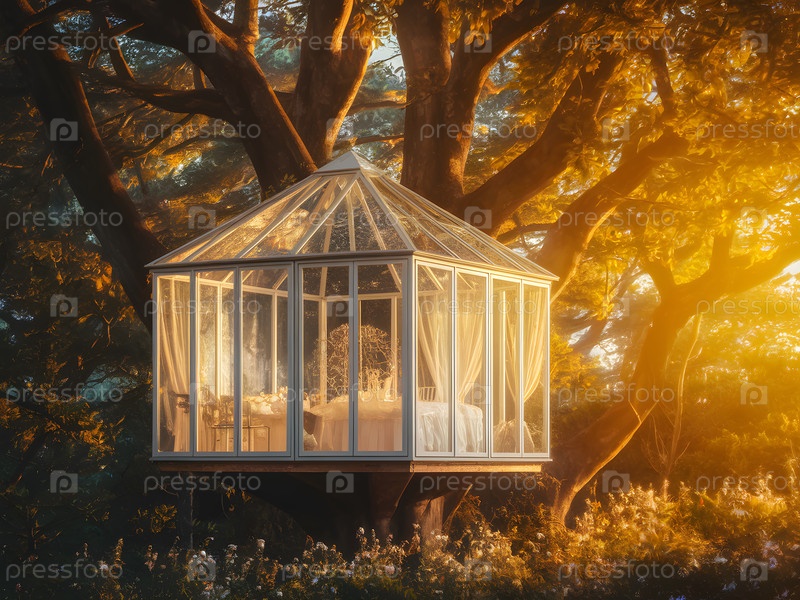 Стеклянный дом на дереве в лесу, изображение создано с помощью Ai