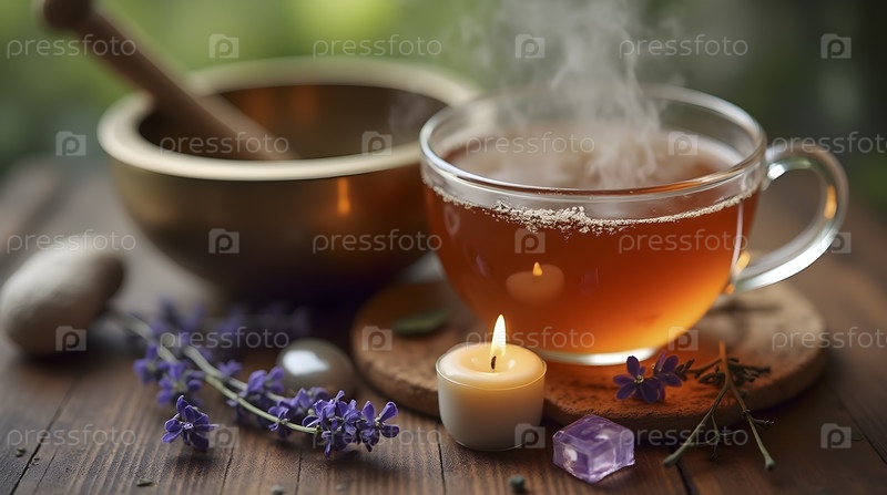 Стеклянная миска с летящим травяным чаем, Ai generated image
