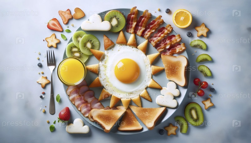 Искусство завтрака с солнечной стороной вверх яйцо как солнце, лучи бекона и облака тостов, Ai created image