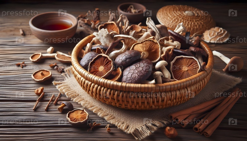 Ручная корзина, наполненная сушеными лекарственными грибами, Ai created image