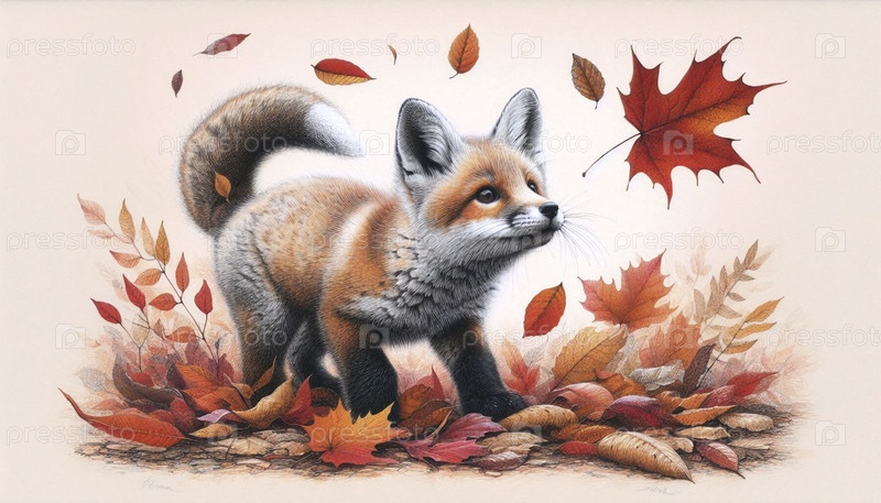 Лисичье детеныше с падающим чернилом листьев рисует художественный принт, Ai generated image