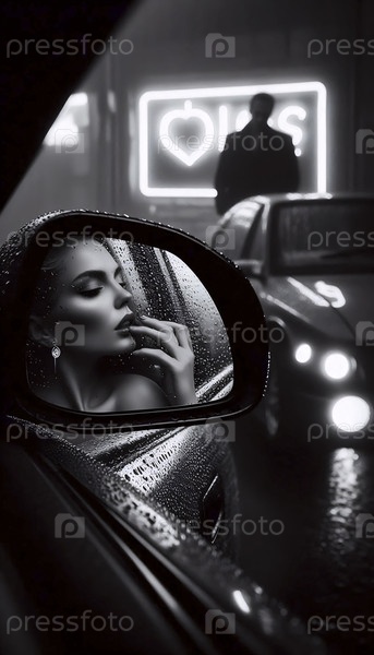 Девушка корректирует серьги в зеркале автомобиля, Ai generated image