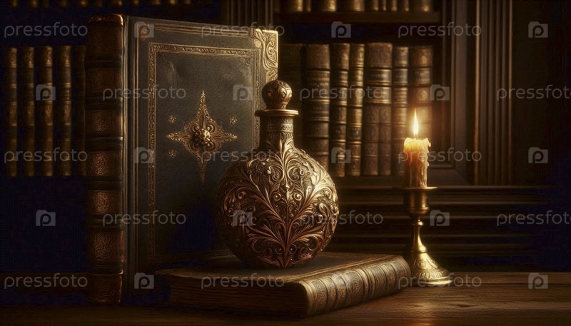 Оформленный макет бутылки парфюма в винтажном стиле, опирающийся на открытое изображение, созданное AI