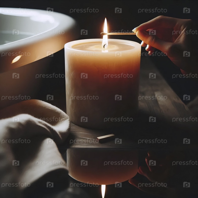 Роскошная ароматная свеча, зажженная в рамках ритуала купания, пламя отражается на воде, Ай создал изображение