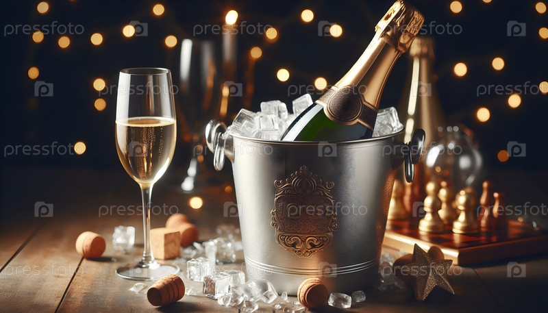 Бутылка шампанского с металлической этикеткой, изображение создано AI