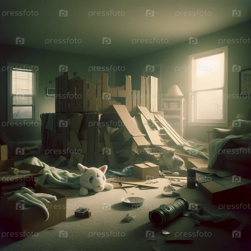 Развалившийся форт одеяла в пустой комнате, Ai generated image