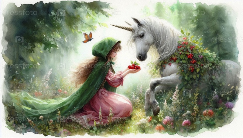 Принцесса и единорог Делятся акварельной живописью Берри, Ai generated image A