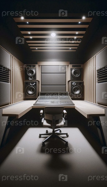 Глубокий макет рабочего стола в студийном стиле с пустым угловым слотом для консоли смешивания, установленный в комнате со обработанными стенами, Ai generated image
