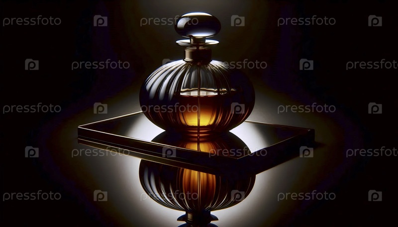 Мокет бутылки с парфюмом из темного копченого стекла на зеркальной подносе, Ai generated image