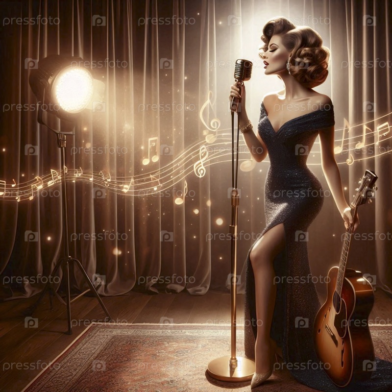 Пин-ап девушка с гитарой, поет в старомодный микрофон, Ai generated image