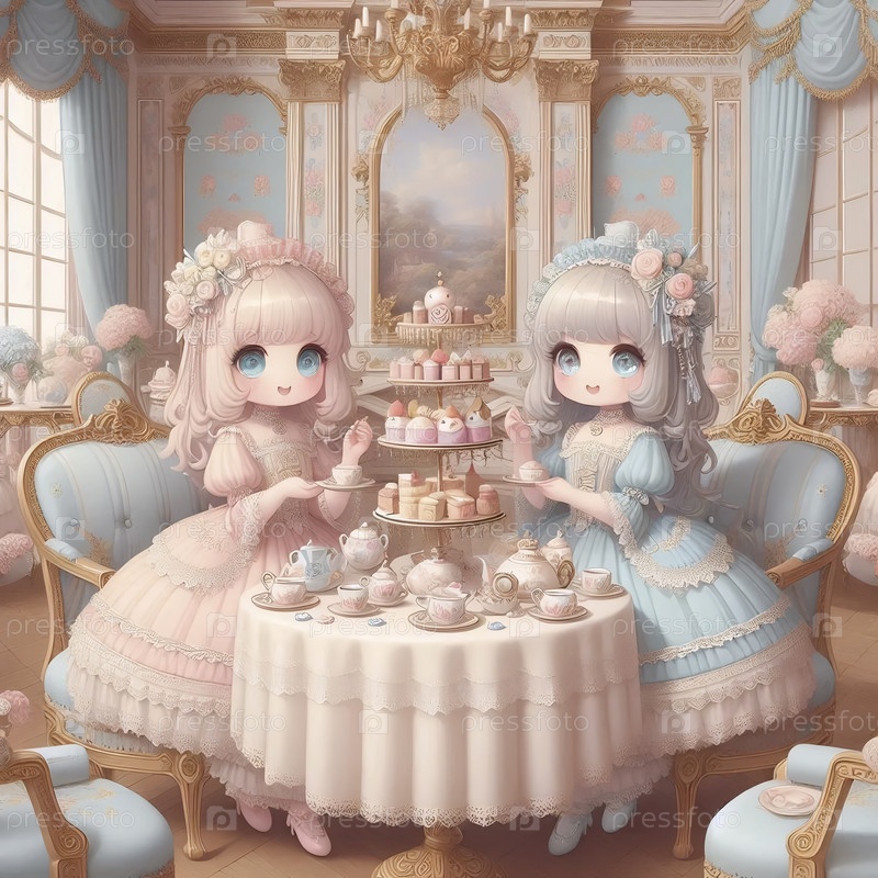Кавайская сцена чайной вечеринки в салоне рококо, Ai generated image