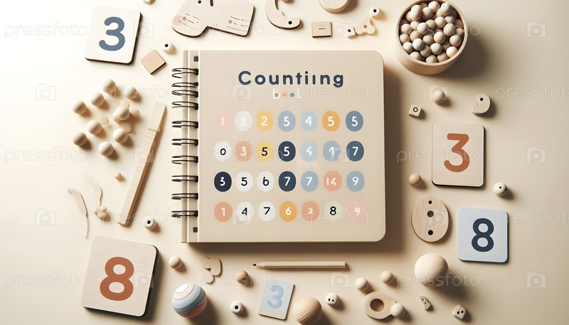 Книга с подсчетом для детей, отображаемая вместе с карточками чисел и деревянными жемчужинами, Ai created image
