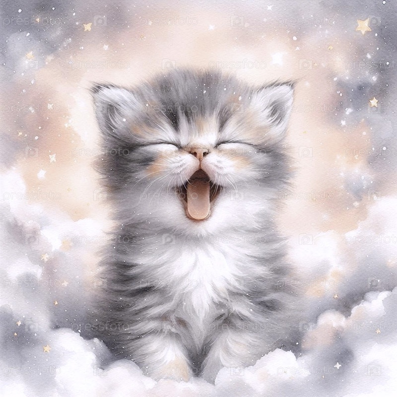 Мечтательный котёнок с акварельным художественным принтом Yawn, Ai generated image