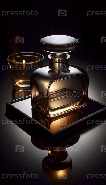 Мокет бутылки с парфюмом из темного копченого стекла на зеркальной подносе, Ai generated image