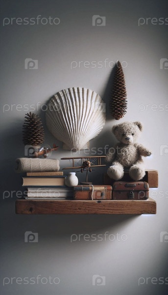 Плавучая полка с драгоценными сокровищами детства: раковина, сосновый конус, модель самолета, Ai generated image