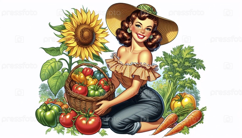 Девушка-принтер в роли садовника, держащего корзину свежих овощей, Ai generated image