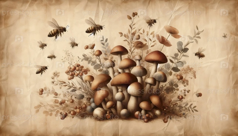 иллюстрация пчел и грибов
