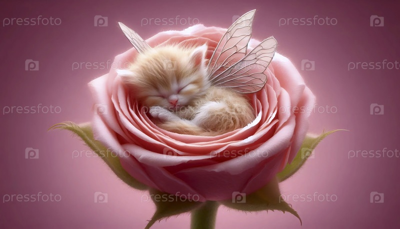 Крошечная фея-кошка спит в цвете, Ai generated image