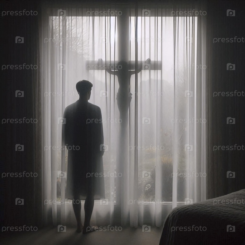 Силуэт распятия, увиденный через простую завесу с фигурой, Ай создал изображение