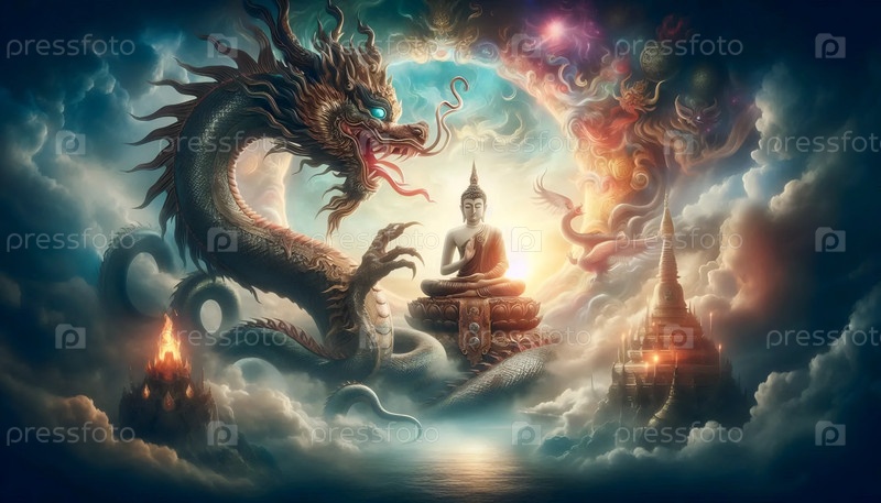 Будда с драконом, Ai generated image