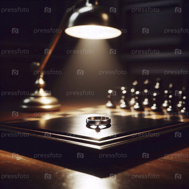 Один пустой макет платинового кольца, расположенный на черном квадрате старой шахматной доски в слабо освещенной студии, Ай создал изображение