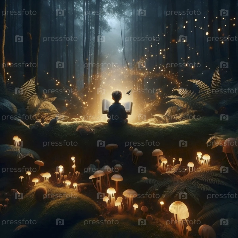 Ребенок читает книгу, которая освещает темный лес, Ai generated image
