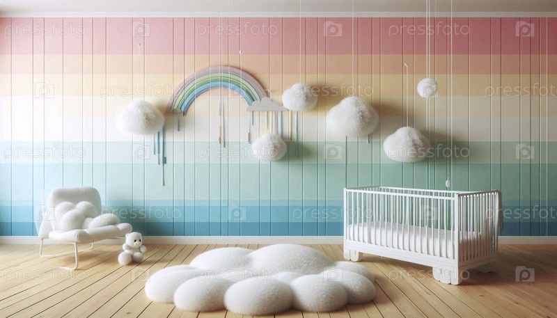 Игровая стена на тему радуги с висящими облаками ткани и пушистым ковром в форме облака, Ai создала изображение