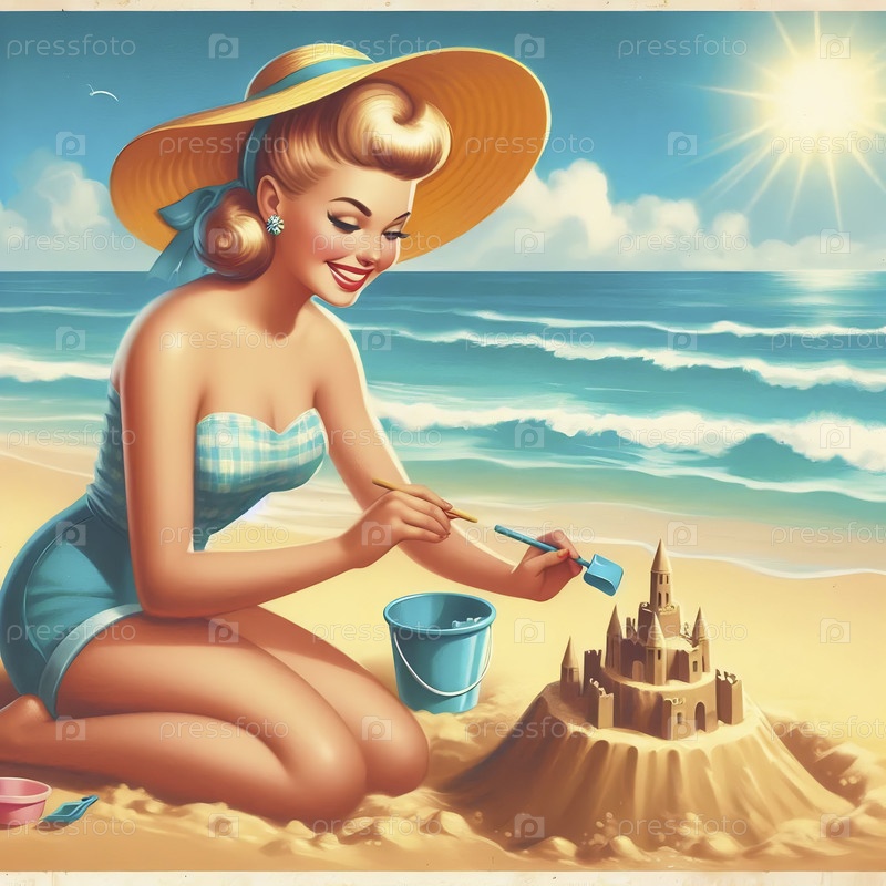 Пин-ап девушка в купальнике строит песчаный замок на пляже, Ai generated image