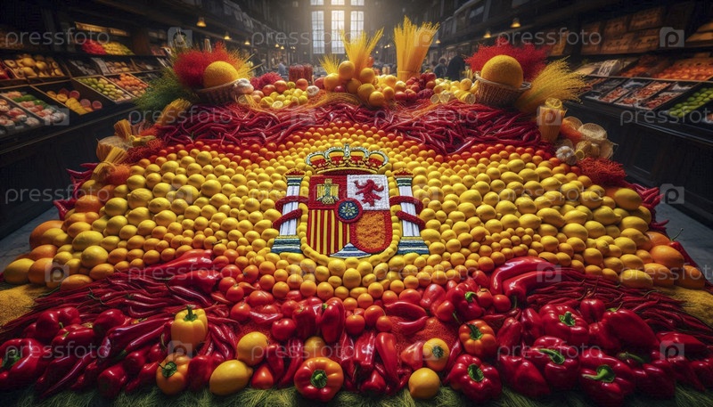 Испанский флаг на оживленном продуктовом рынке, Ai A generated image