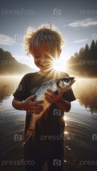 Ребенок гордо держит большую, только что пойманную рыбу на берегу озера с ранним утренним солнцем позади себя