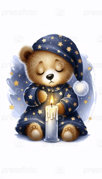 Спящий медведь в звездном ночном халате Акварельная художественная печать, Ai generated image