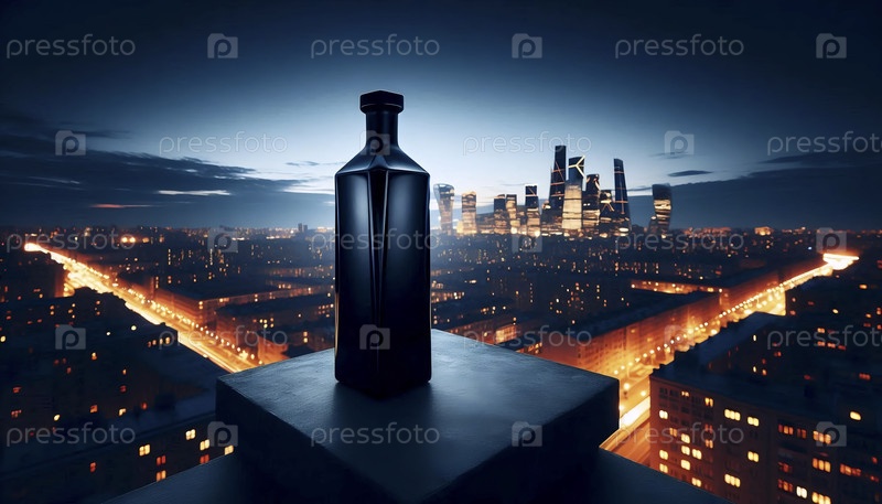 Современный угловой макет бутылки, расположенной на парапете городской крыши во время синего часа, Ай создал изображение